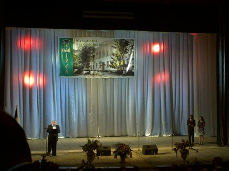 Este un moment istoric si dupa spusele dl presedinte, deoarece a mentionat ca si el o terminat o facultate aici si acum il ajuta sa sa conduca un stat, care se confrunta cu probleme de diferit tip. Teatrul de Opera si Balet a fost gazda acestei festivitati minunate … ca fundal pe scena a fost atasat logotipul Universitatii, vedeti imaginea